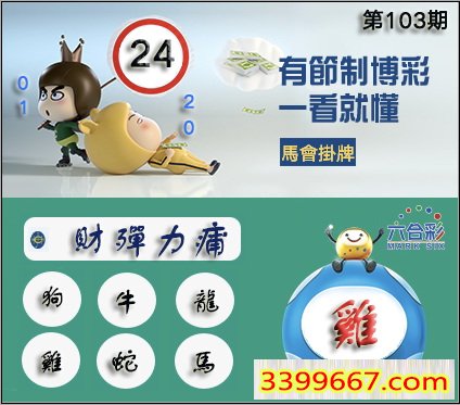 103期正版彩图挂:24 爆:鸡 挂牌成语:财殚力痡 挂牌出肖:狗牛龙鸡蛇马